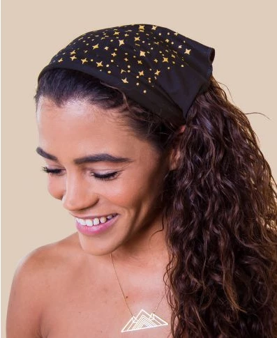 Be a free spirit and express yourself to the universe with this cute headband that looks like a bandana. This vibrant star print will help your free spirit soul shine! This organic bandana has a comfortable, soft feel with a stretchy elastic band (no ties or strings to worry about!) Our Bandana Headband features an overlock decorative stitch on the edges (versus a traditional rolled hem). This lightweight seam creates a slight roll of the fabric and allows us to screenprint closer to the edges of the bandana. Black.