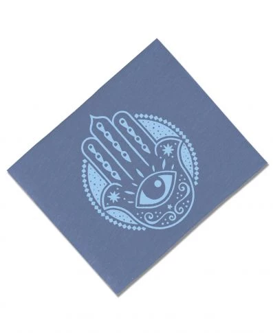 Protect your spirit from all negative vibes as you wear this Hamsa Hand Headband. Features a decorated Hamsa Hand printed on an eco blue fabric to ease your soul. Made in the USA. 50% organic cotton, 50% recycled plastic (from recycled beverage bottles). 9 inches wide by 8 inches tall (laying flat) – fabric can stretch from 18 to 26 inches in circumference. Eco Light Blue.