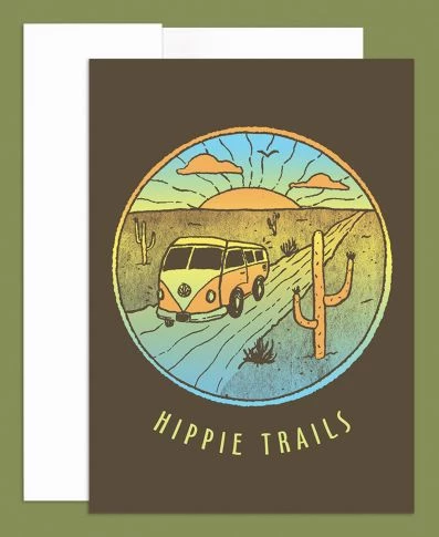Give a little peace, love, and travel vibes when you use this Hippie Trails Greeting Card. This eco-friendly card features a cool desert bus scene and the words: HIPPIE TRAILS Includes a smooth surface for writing and a blank inside and envelope. Made in the USA. 100% post consumer-recycled paper. 5 x 7 inches.