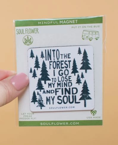 Get lost into the love of our Earth when you use this Into the Forest Magnet. Features a vintage-inspired pine tree design and treehugger inspired text. Stick this magnet to your fridge, car or locker and feel good vibes.