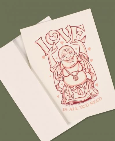 All you need is love! This Soul Flower original design is a perfect way to send an eco card to someone you love. Displayed on the front is a happy Buddha design and the words, ‘LOVE IS ALL YOU NEED’. Blank inside with a matching envelope. Made in the USA. 100% post consumer recycled paper. 5 x 7 inches, by Soul Flower.