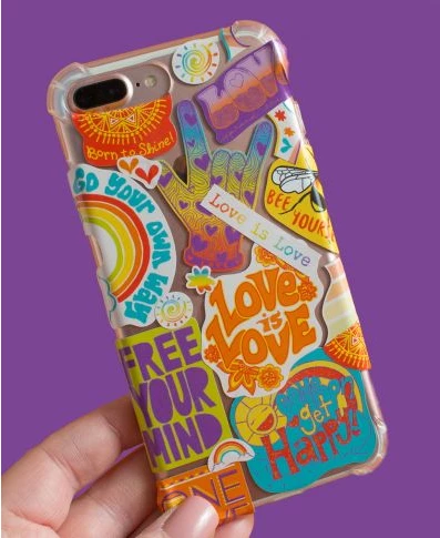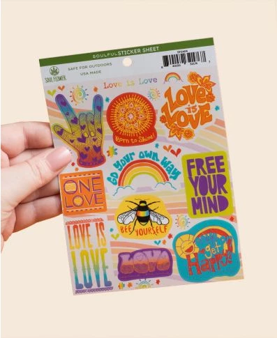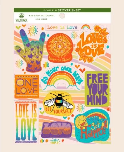 This vibrant Love is Love Sticker Sheet will emit happy vibes into all of your days. Become inspired through love as you use these outdoor safe vinyl stickers. Ideal for your mirror, car bumper, journal, coffee mug, water bottle, or cellphone. Messages include: Go Your Own Way, Love is Love, Free Your Mind, and Come On Get Happy. Sheet contains 10 peel-off stickers and a few extras just for fun. 5 x 7 inches.