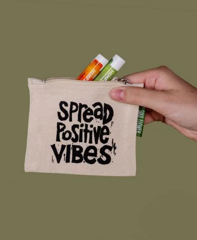 Spread positive vibes everywhere you go when you use this small zipper pouch that reads: SPREAD POSITIVE VIBES. Ideal for holding your favorite smallest treasures. This positive message coin pouch pairs perfectly with our Manifesto Large Zipper Pouch and Manifesto Eco Tote Bag. 5.5 x 4.5 inch pouch. Fair Trade Certified. Hand printed in the USA. 100% organic cotton.