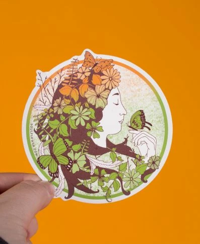 Nurture your mind, body, and soul within the beauty of this Mother Nature Sticker. Send your love to our Mother Earth as you admire the beauty of her kind butterflies, leaves & flowers. Outdoor safe vinyl sticker. Made in the USA. 4 inch circle.