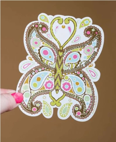 This unique butterfly sticker is filled with seventies vibes and paisley love. Be as free as a butterfly wherever you display this beauty: use it as a butterfly car decal or stick it on a laptop, guitar or notebook. Spread your wings and fly. Die cut. Outdoor safe vinyl sticker. Made in the USA. 4 x 5.2 inches.