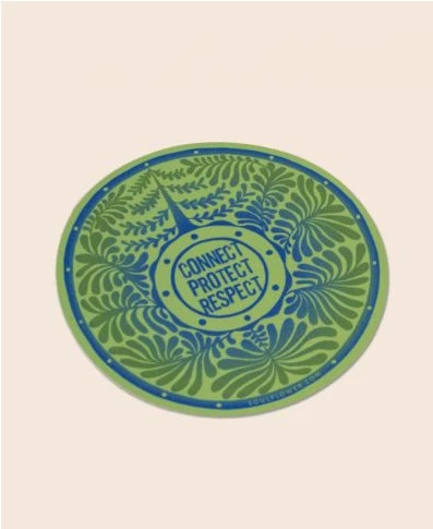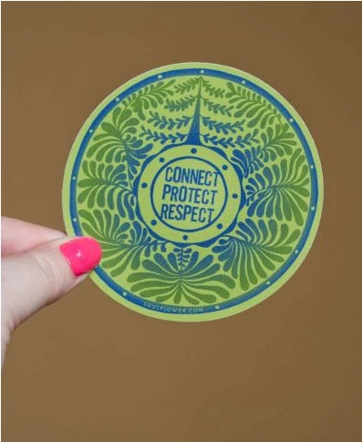 Connect, protect, and respect our natural world with this badge of nature sticker. Use this sticker to spread a message to the world and help protect nature. One of our environmental stickers at Soul Flower. Outdoor safe vinyl sticker. Made in the USA. 4 inch circle.