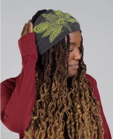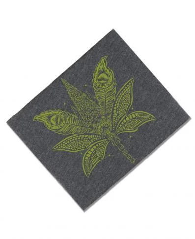 Inhale bliss; exhale distress. Wear this Sacred Cannabis Boho Headband to rejuvenate your soul. Admire the cannabis leaf image and its intricate nature and dragonfly designs. Created with an organic fabric and features raw seams. 9 inches wide by 8 inches tall (laying flat) – fabric can stretch from 18 to 26 inches in circumference. Eco Black.