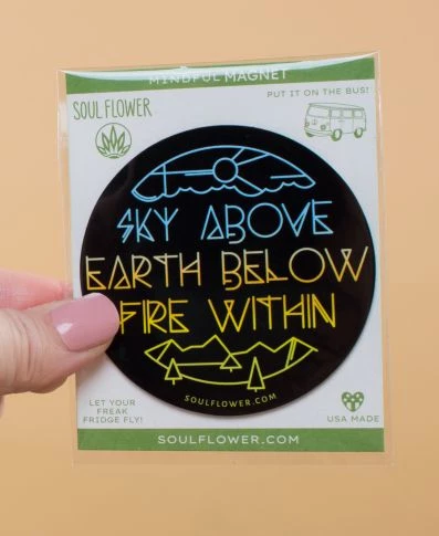 Open your heart, become grounded, and radiate love with this mindful magnet. Magnet reads, Sky Above, Earth Below, Fire Within. Sticks to any metal surface.