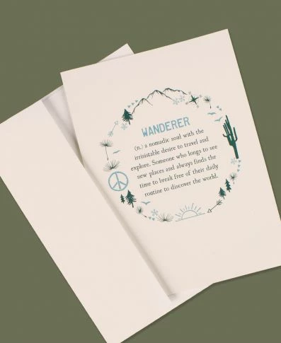 Inspire a friend or loved one with this wanderer definition greeting card. Front of card features original artwork of nature and reads: “Wanderer (n.) a nomadic soul with the irresistible desire to travel and explore. Someone who longs to see new places and always finds the time to break free of their daily routine to discover the world.” Blank inside with a matching envelope. Made in the USA. 100% post consumer recycled paper. 5 x 7 inches, by Soul Flower.