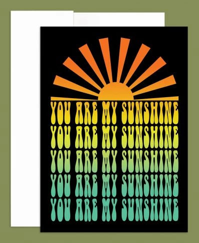 Send a You Are My Sunshine Greeting Card and make someone happy when the skies are gray! Features a retro sun with the text, You Are My Sunshine. Use the smooth surface and blank inside to write a sweet message. Envelope included. Digitally printed in the USA on 100% recycled paper. 5 x 7 inches.
