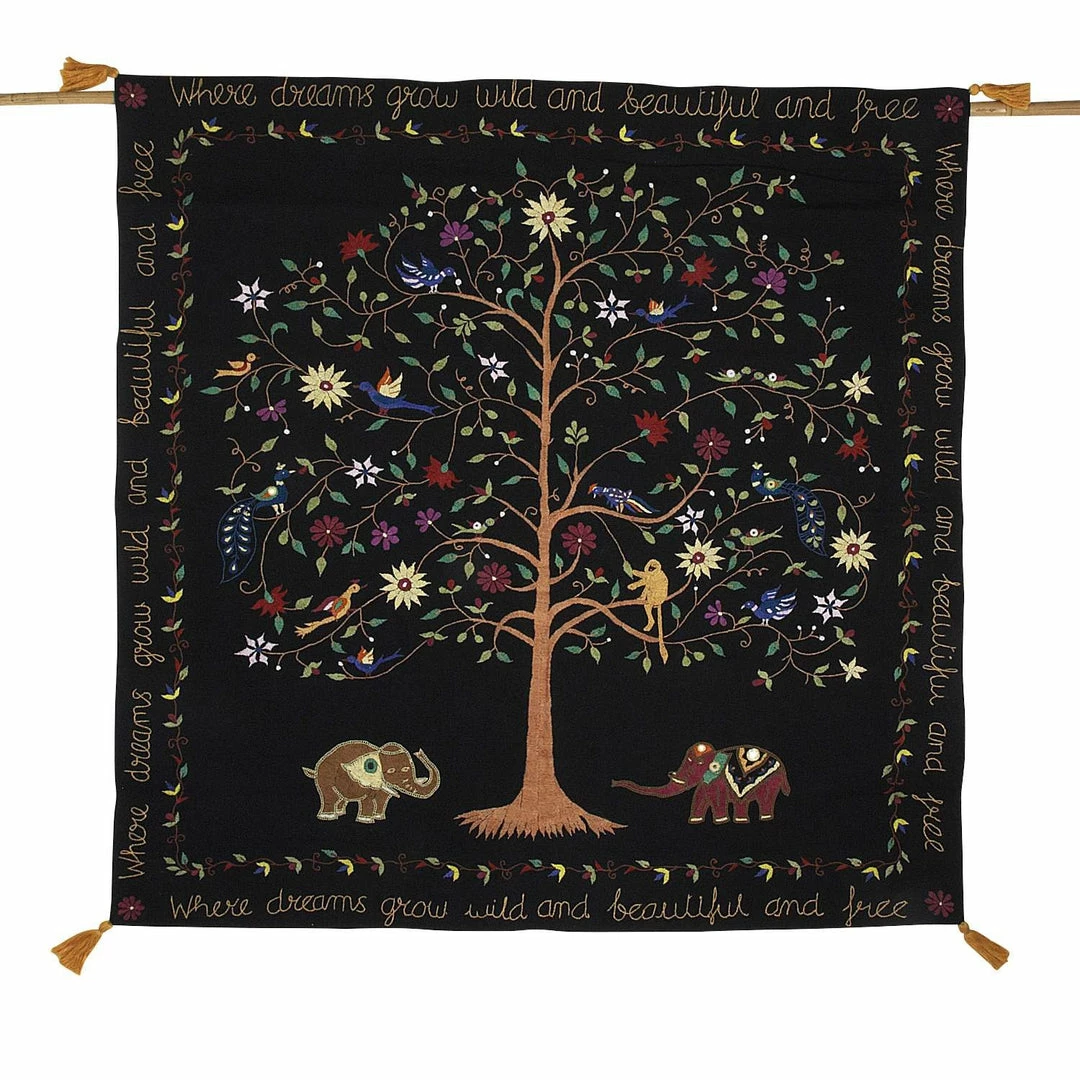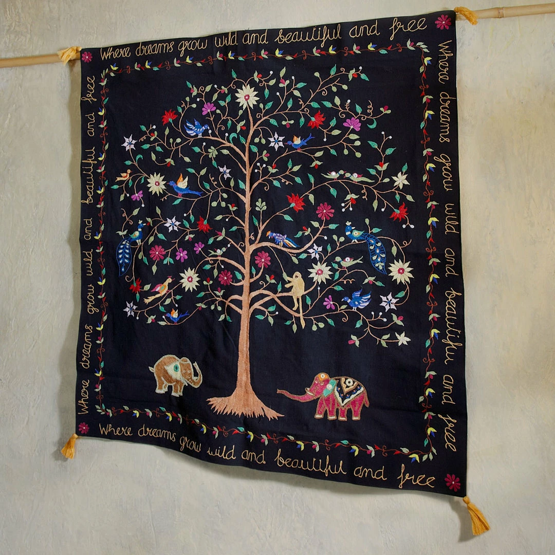 โWhere dreams grow wild and beautiful and free.โ This hand-embroidered wall hanging holds a dreamlike quality. Lovingly stitched by the artisans of St. Maryโs Mahila Shikshan Kendra, it depicts harmonious birds, monkeys and elephants. A Ten Thousand Villages exclusive design. A beautiful Global Fair Trade gift.
