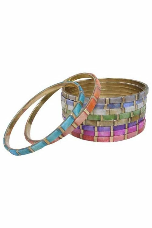 Light up your wrist with these Indian bangles. Bangles are hand-inlaid mother-of-pearl on brass base. Dyed mother-of-pearl in assorted pastel colors. We’ll surprise you with a selection of 5 bracelets chosen from 10 beautiful pastel shades. A beautiful Global Fair Trade gift.