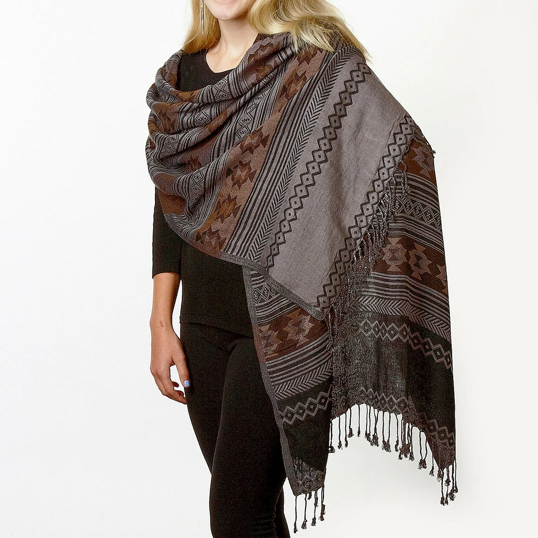 - Hand-woven viscose/wool blend scarf with gray, black, and brown geometric jacquard pattern