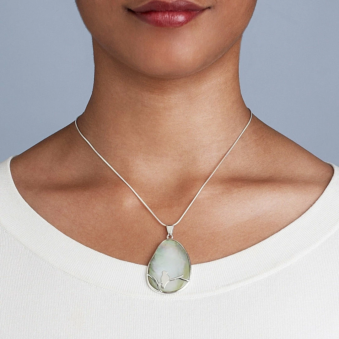 Mother-of-pearl creates a luminescent quality that seems to capture the beauty of moonlight. A single bird sits perched on a silver branch, silhouetted against this moonlight. We can almost imagine it singing as the day turns to night. From the artisans of Allpa, Peru. A beautiful Global Fair Trade gift.