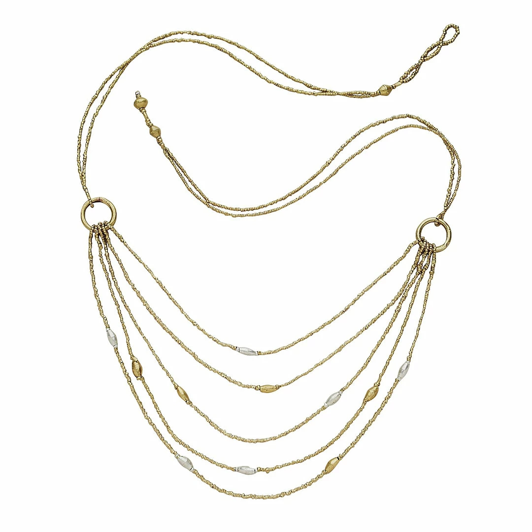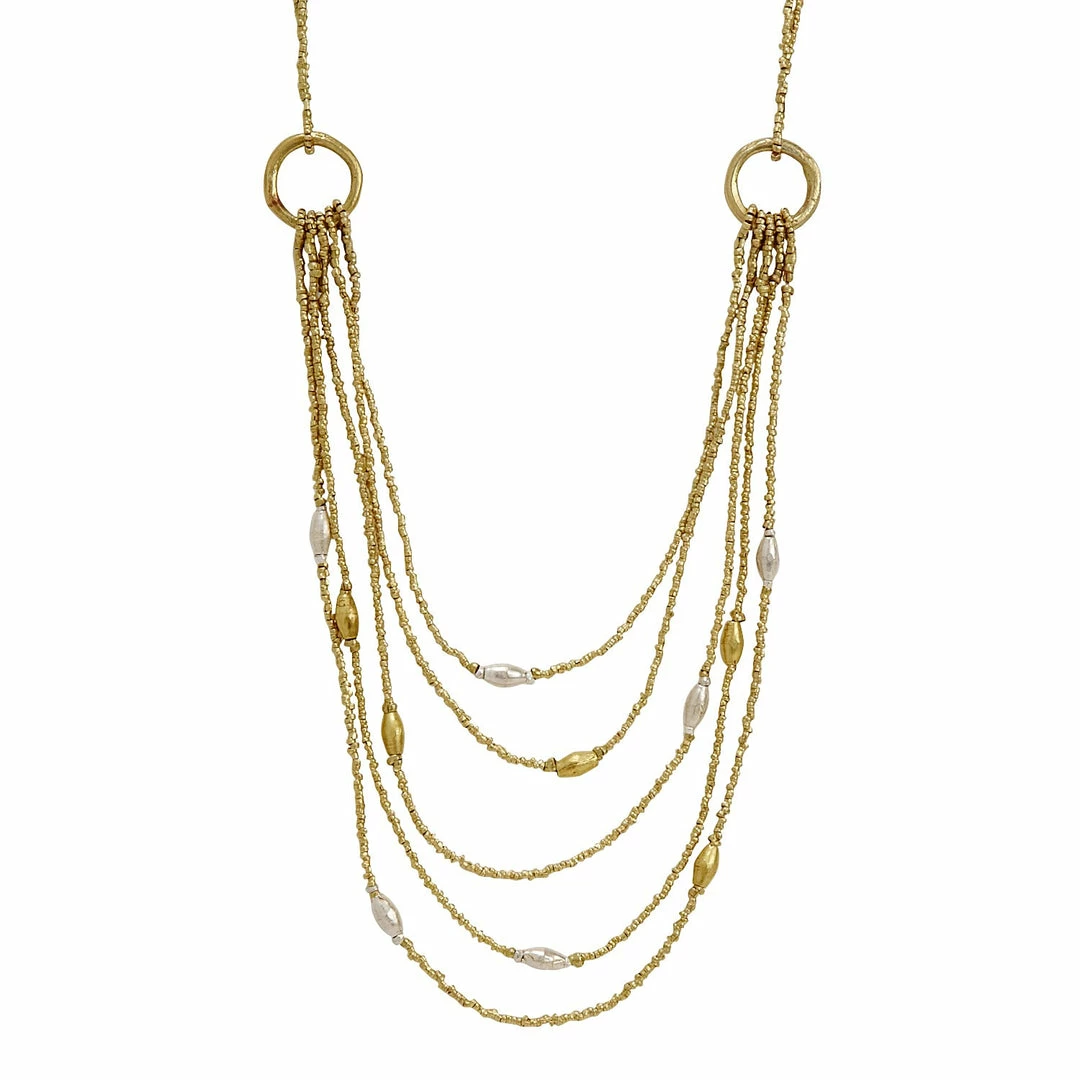 Two brass rings connect five strands of recycled bullet brass beads in the front and two strands in the back. The front strands are interspersed with larger silver-plated copper beads and recycled bullet brass beads. A beautiful Global Fair Trade gift.