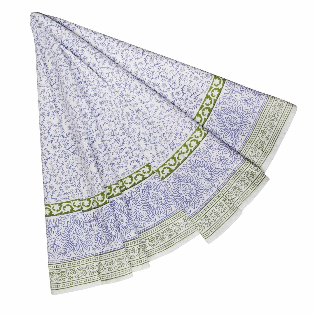 Stylized flowing patterns, in soft spring colors of blue and green. A circular tablecloth to celebrate new beginnings. When the Indian government dedicated a large area of Rajasthan as a controlled tiger habitat, many villagers were forced to relocate to the fringes of the land, and women with few employment options began illegally cutting wood to sell as fuel. A local nongovernmental organization trained women in embroidery and tailoring for income opportunities.
