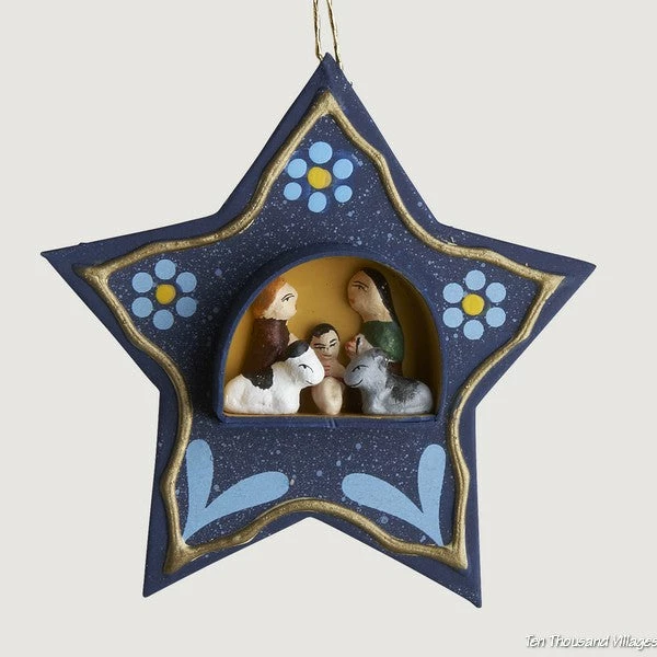 A miniature retablo of the nativity scene is nestled safely into a paper star. Retablos, or image boxes, portraying scenes of faith and daily life, were originally brought to Peru from Spain. These retablos join this centuries-old art form. Decorative only. Keep out of reach of children. A Global Fair Trade gift.