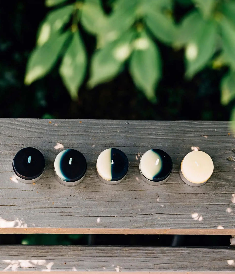 - Box: 9.5L x 2.25W x 1.5H inches; Each tealight candle: approximately 1.5D x 1H inches; Box is held closed by a silver‒colored ribbon measuring approximately 24L inches