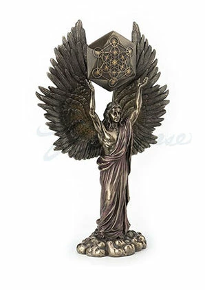 This unique sculpture features Metatron, the angel. He holds up his Cube, sometimes called the Flower of Life. It is a symbol steeped in legend. To some, God created the universe using Sacred Geometry, and this represents that. A powerful and striking collectible made of cold cast bronze with exquisite details. Measures 9 1/4″ x 3 7/8″ x 13 3/4″.