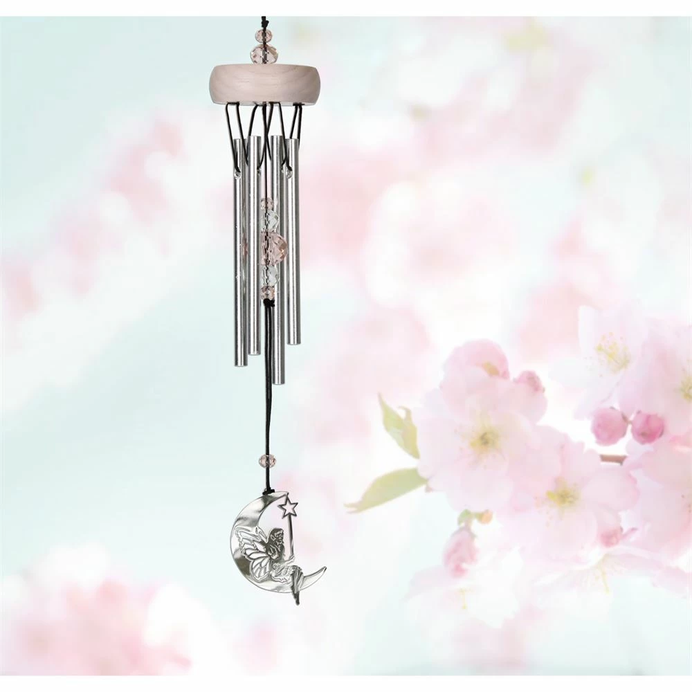 Delicate chiming combines with sparkling crystals and motifs from nature and mythology to enchant and delight. A silver fairy on a crescent moon acts as the windcatcher (or, if you will, dreamcatcher) of this chime. Pink and clear faceted crystals embellish the chime, symbolizing the free spirit of these magical beings. Measures 10″ overall length and is made of pink wash finish ash wood.