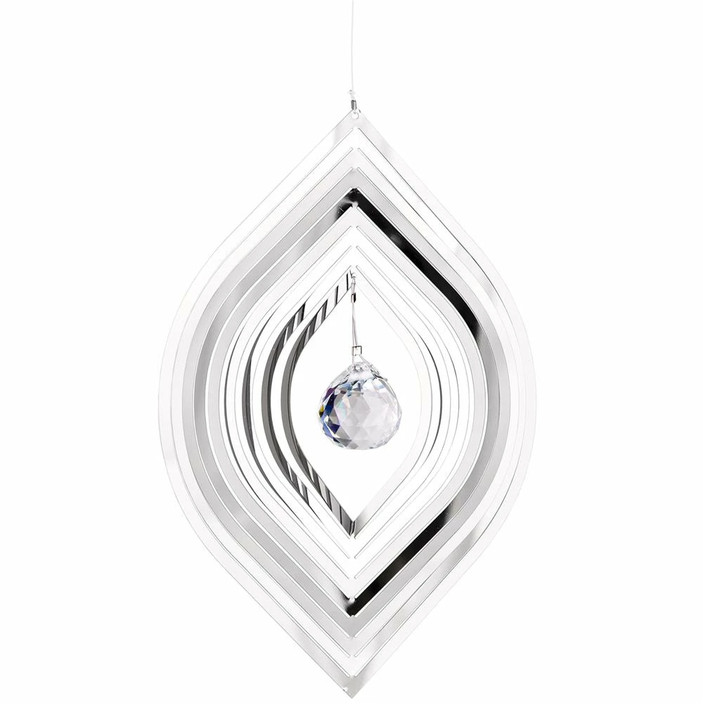 The marquise shape is flashy and bold. These curved rings surround a crystal center. Together they reflect and sparkle, creating a breathtaking display of shimmering light. Comes with approximately 20 inches of line and an alligator clip, which makes hanging this pretty suncatcher a breeze. Dimensions: 5 in. Long, 25 in. Overall Length (with hanging line), made of polished stainless steel from Woodstock Chimes.