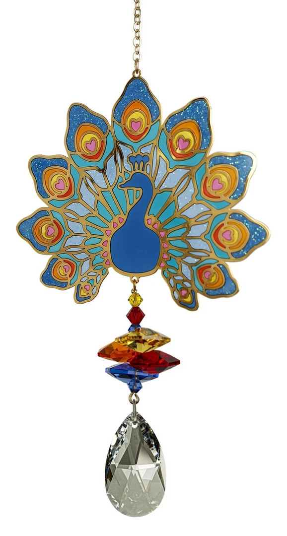 Peacocks symbolize different things in various cultures. One theme common to all is that the “eyes” in the bird’s tailfeathers represent watchfulness, protection, vision and pride or self-worth. It’s also said that peacocks can predict rain, as they dance when they sense a storm coming. Our Crystal Wonders – Peacock can predict the weather, as well – when the sun is shining through its “stained glass” panels, it’s sure to be a beautiful day!