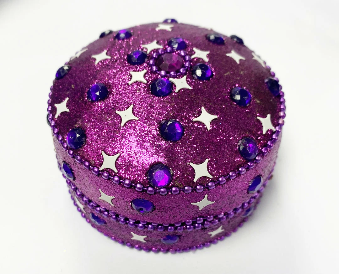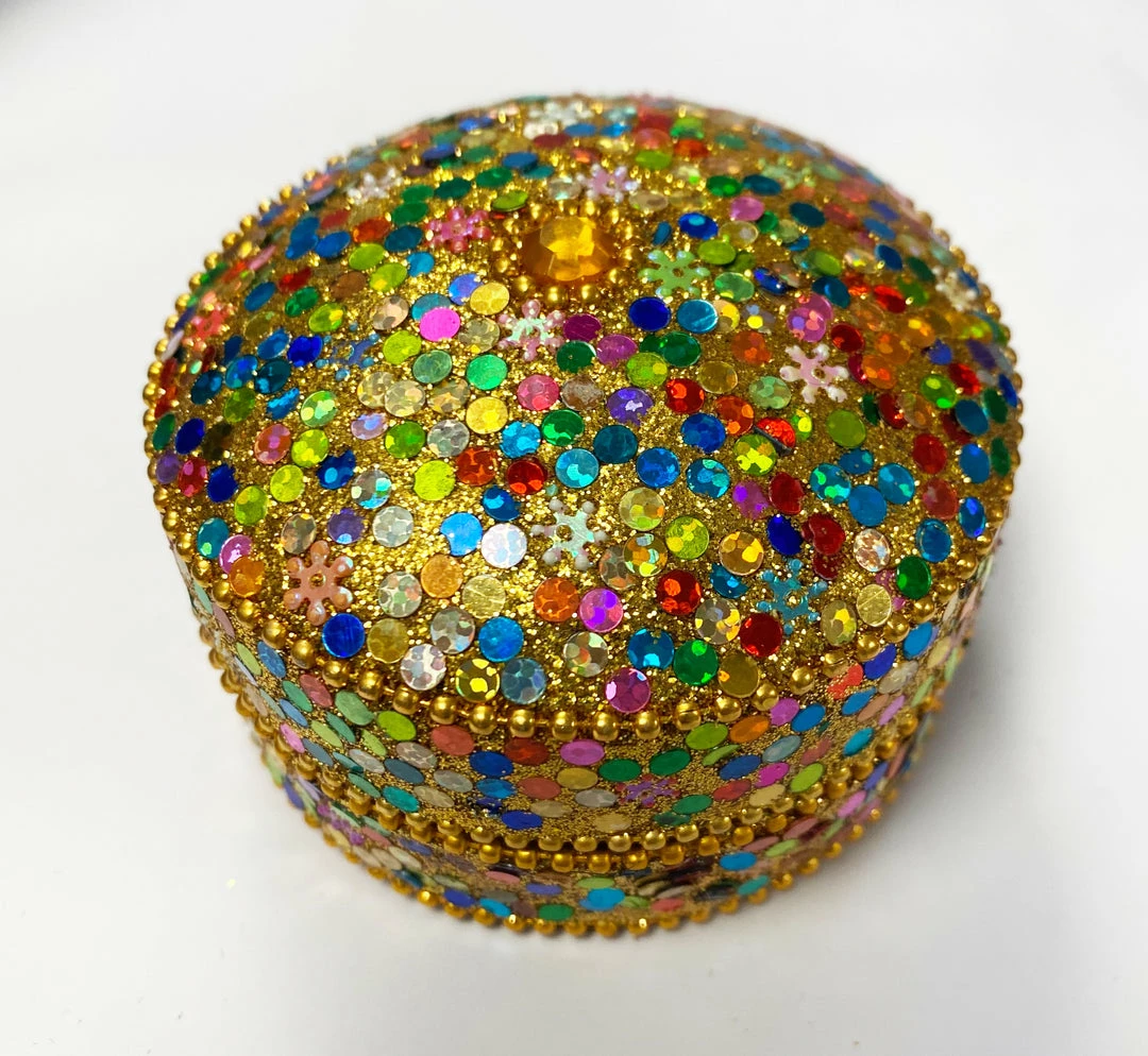Add a touch of colorful sparkle! These boxes are 3″ diameter and large enough to hold several keepsakes, rings, etc. Assorted designs.