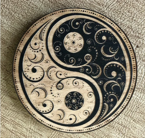 This is a wood Mandala Magnet. The magnet is approximately 3 inches in diameter and 1/4″ thick. It is made out of birch plywood and black paint. Handcrafted in the USA.